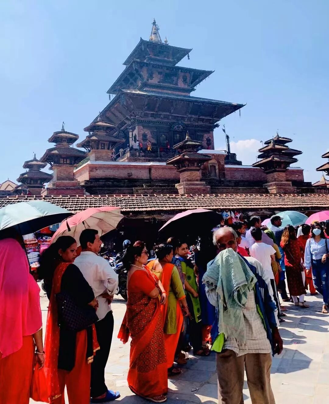 虔诚信众排队前往塔莱珠神庙,队伍环绕整个杜巴广场