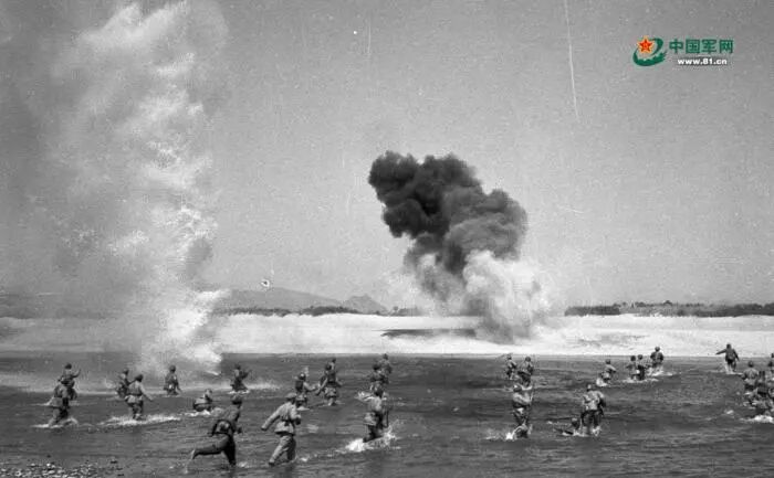 1951年1月,志愿军战士冒着炮火渡过汉江,追击敌人。图片来源:中国军网