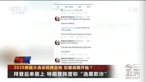 如今摇摆州形势不妙,特朗普团队已分别在密歇根和宾夕法尼亚提出暂停计票诉讼。此外特朗普私人律师、前纽约市长朱利安尼已赶往宾夕法尼亚州的费城,他在推特上声称,当地有大规模“选票诈欺”。