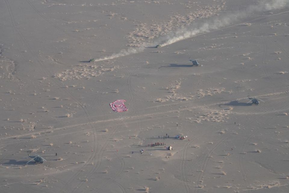 ↑11月14日,载着神舟二十号航天员乘组的神舟二十一号载人飞船返回舱在东风着陆场成功着陆。新华社发(汪江波 摄)