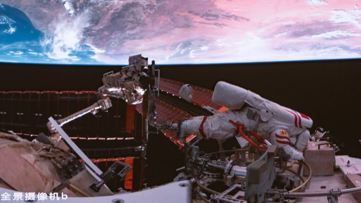 ↑这是9月25日晚在北京航天飞行控制中心屏幕上拍摄的神舟二十号乘组航天员王杰在空间站组合体舱外作业的画面。新华社记者李明刚 摄